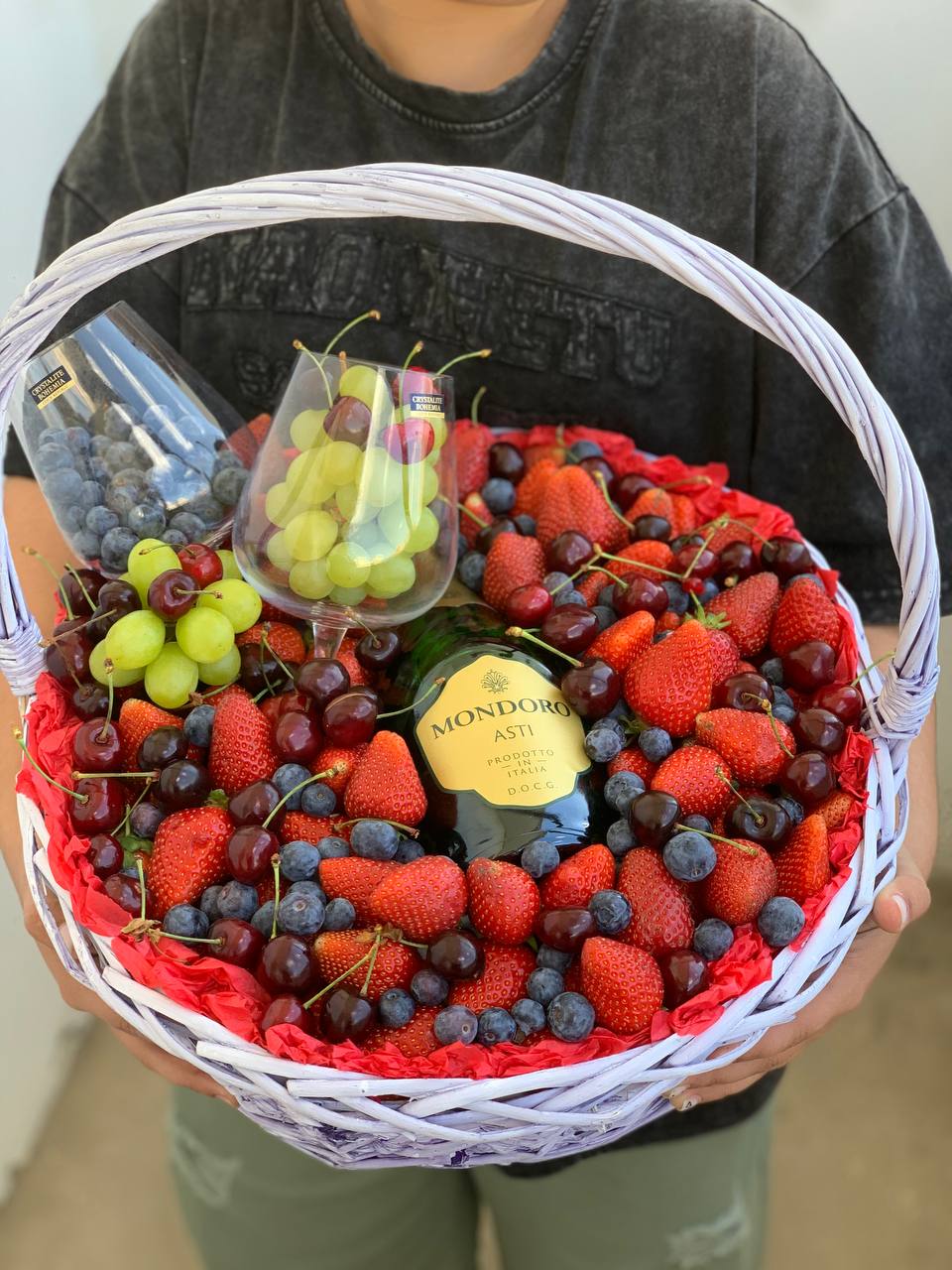 Корзина ягодная из клубники, голубики и черешни , с добавлением голубики и винограда