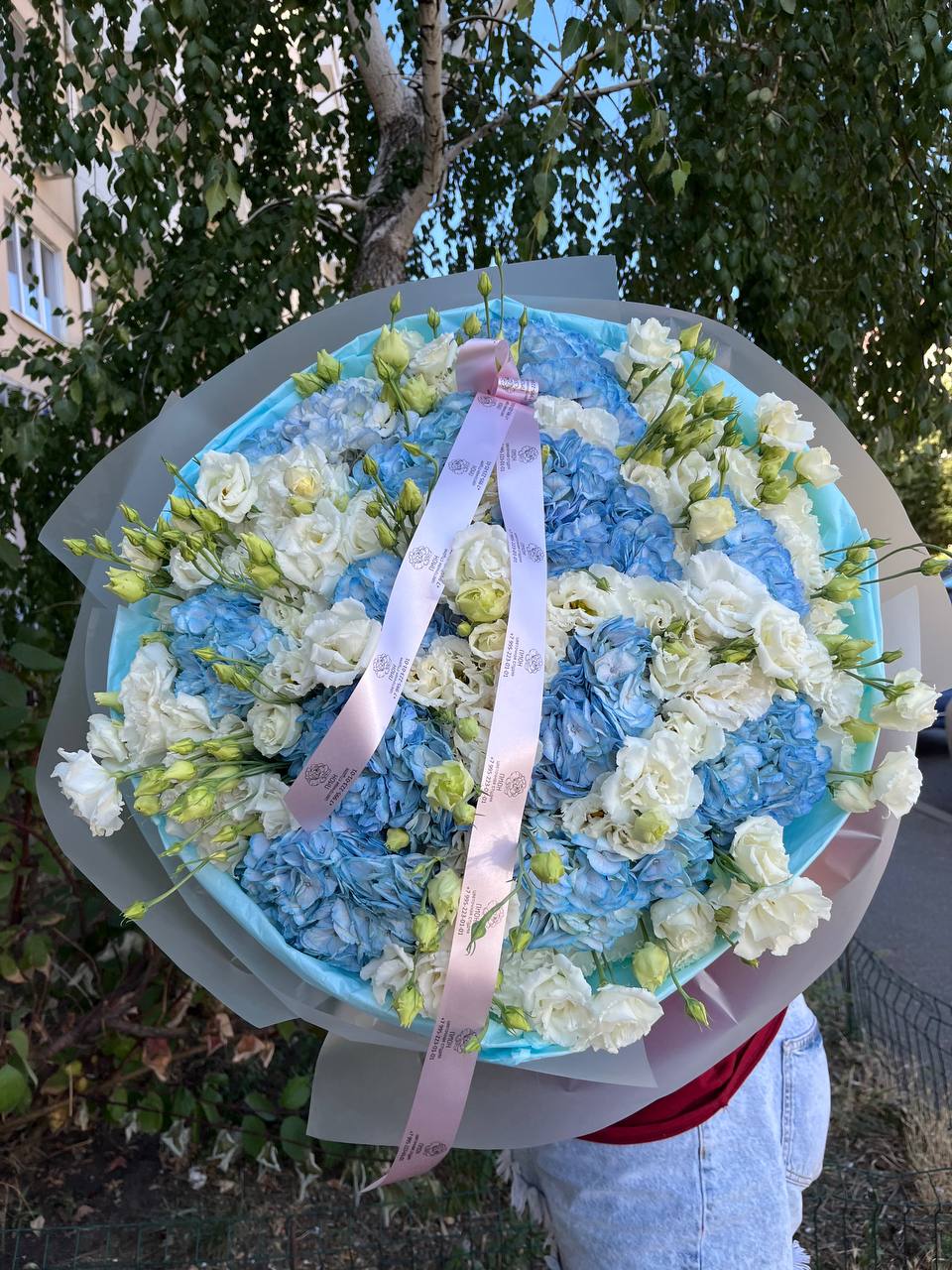 Букет из голубой гортензии и эустомы