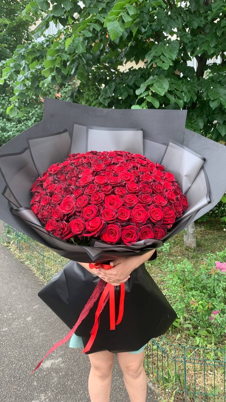 Букет 101 роза в черном оформлении