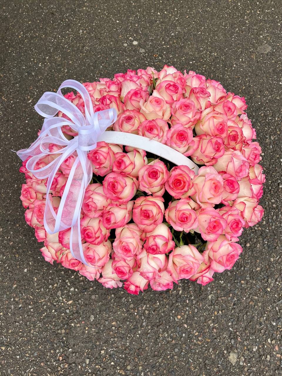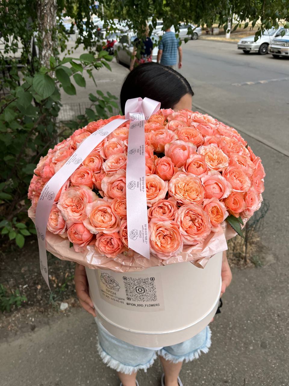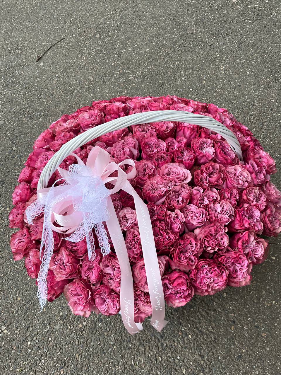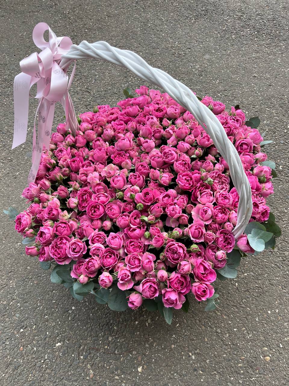 Корзина гигант из кустовых пионовидных роз сорта мисти бабалс с добавлением эвкалипта