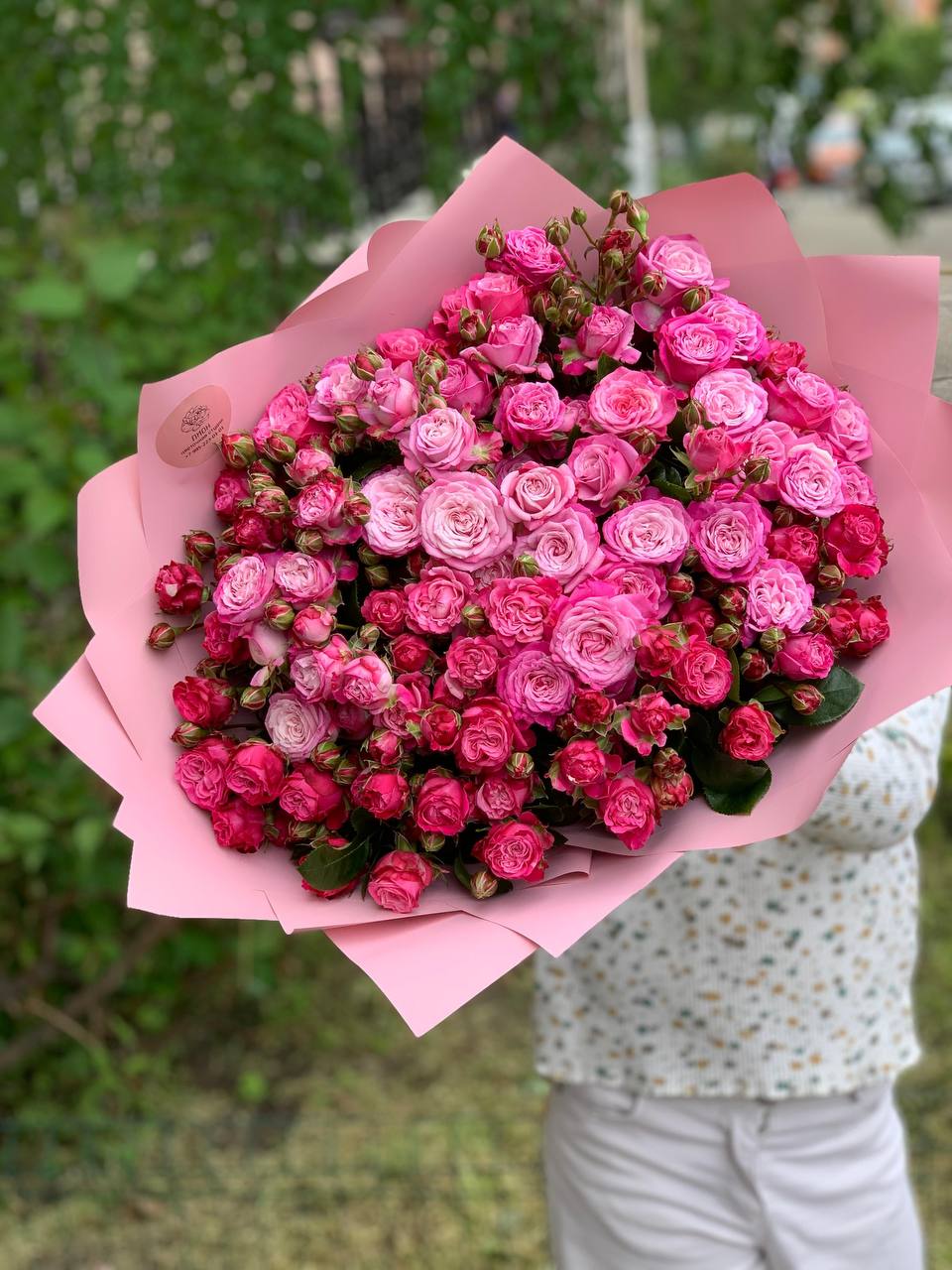 Букет гигант сборный из вывернутых французских роз и кустовых пионовидных